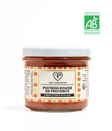Poivrons rouges* 50 % [origine Provence], concentré de tomates* 20% [origine France], pommes* 16 % [origine France], huile de tournesol*, huile d’olive vierge extra*, sucre de canne roux*, jus de citrons concentré*, piment d’Espelette AOP
